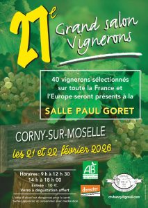 Retrouvez nous au 26ème grand salon vignerons à Corny sur Moselle les 22 & 23 février 2025 de 9h à 12h30 et de 14h à